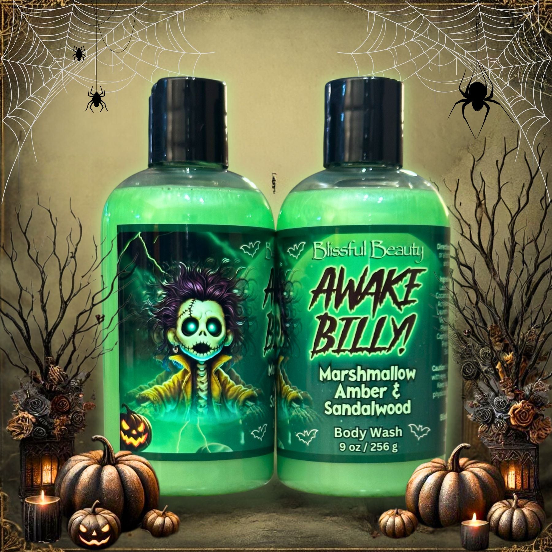 Our Awake Billy! Body Wash lathers up in toasted marshmallow, glowing amber, and zombied sandalwood, wrapping your skin in a warm, smoky-sweet fragrance that clings like midnight fog.