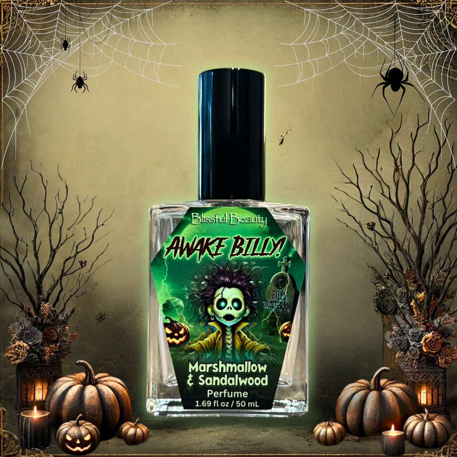 Our Awake Billy! Perfume is a haunting blend of toasted marshmallow, glowing amber, and zombied sandalwood, finished with whispers of sugar, cedar, and clove. Dark, smoky, and sweet—it’s the perfect fragrance to awaken your senses and leave a trail of cozy, witchy allure.