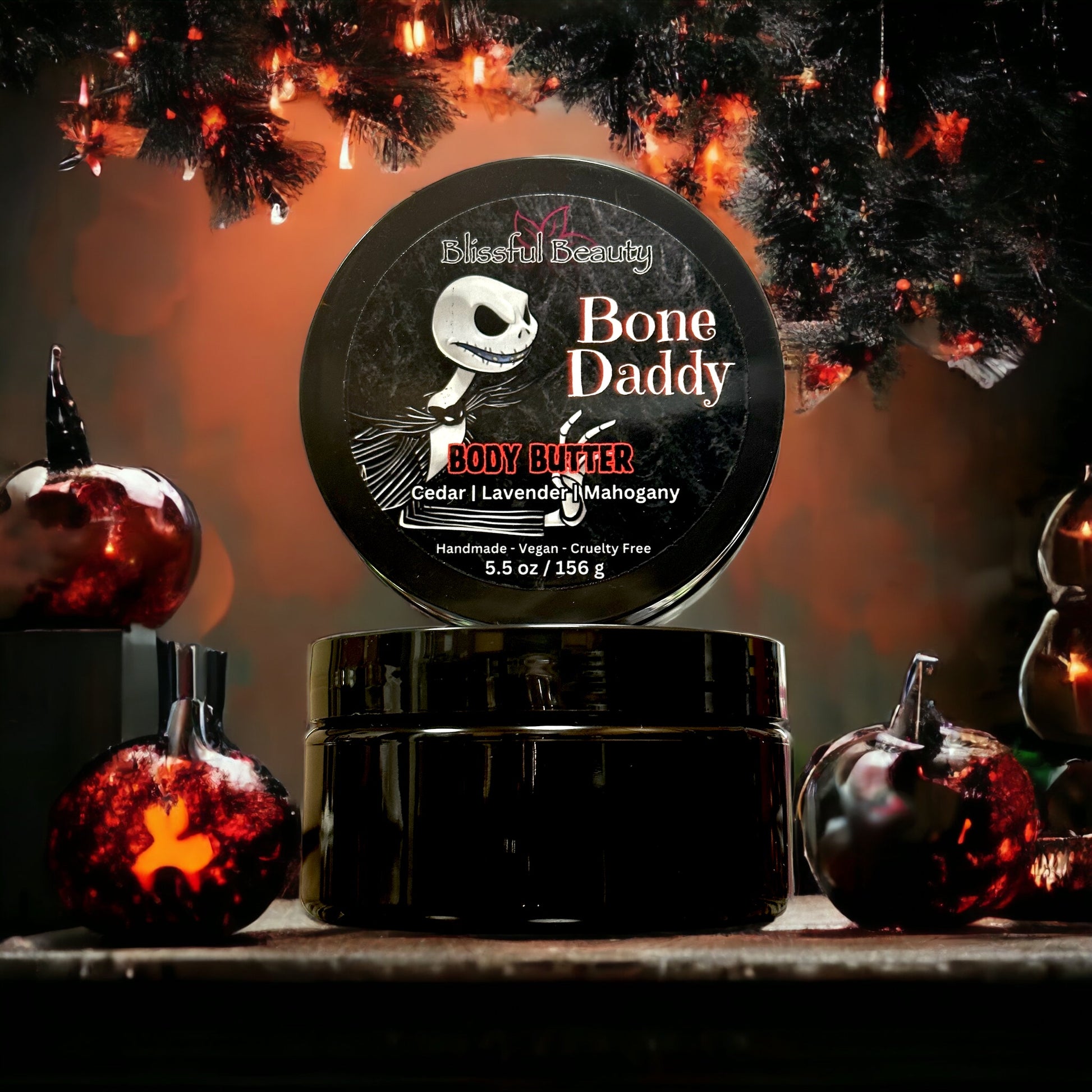 Bone Daddy Body Butter, a luxurious elixir inspired by the enigmatic Jack, exuding the sophisticated aura of a realm draped in spook and charm. With top notes of cedar and musk, a heart of soothing lavender, and a deep, mysterious base of mahogany, geranium, and oak, this body butter encapsulates Bone Daddy's refined persona. Immerse yourself in the allure of Halloween Town with this sophisticated blend, providing a velvety touch to your skin. Embrace the magic of Jack's quest for adventure and elegance with Bone Daddy Body Butter.