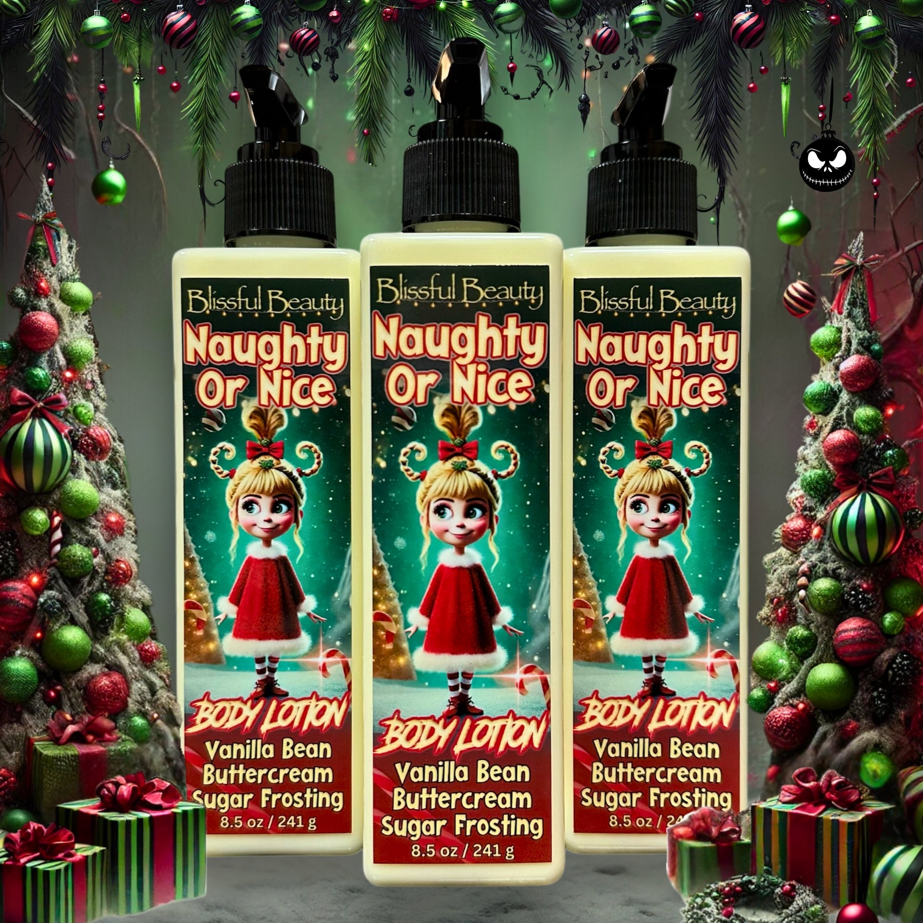 Will you be Naughty or Nice this holiday season? đ Our Cindy Lou Who-inspired Naughty or Nice Body Lotion is a treat for your skin, with a cozy blend of creamy vanilla bean, rich buttercream, and a sprinkle of sugar frosting. This lotion wraps you in a sweet, holiday scent thatâs perfect for feeling festive (whether youâre on the naughty list or the nice one!).