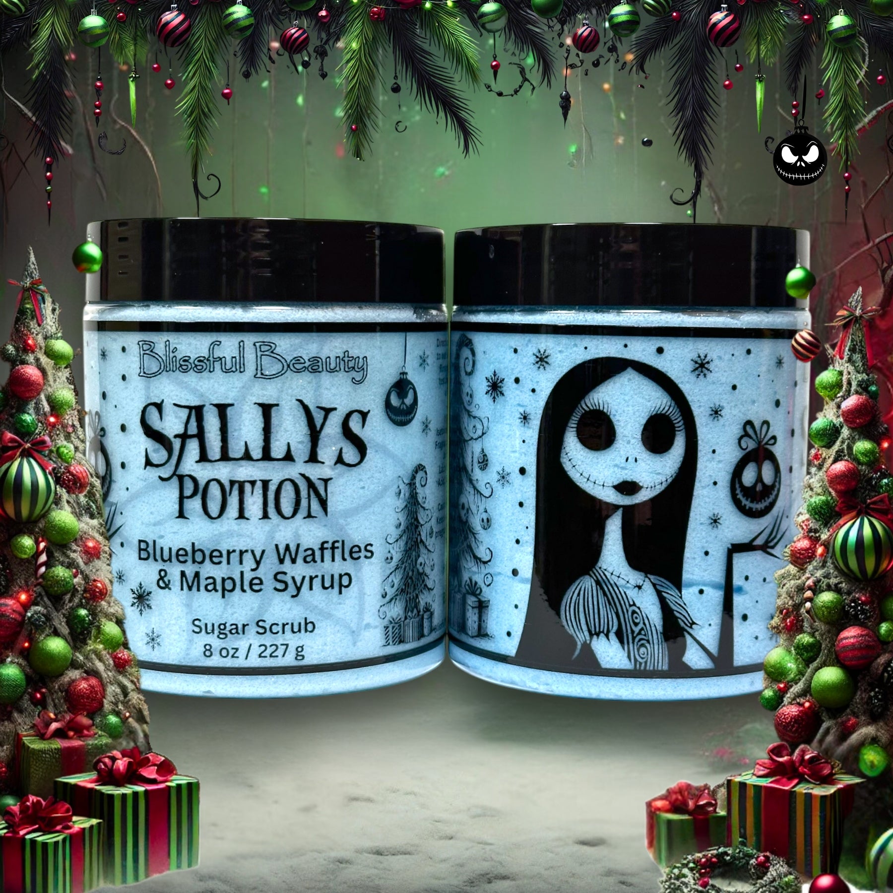 In the quiet of Halloween Town, under a moonlit sky, Sally stirs her latest creation—a potion as sweet as it is enchanting. You scoop a bit of Sally’s Potion Sugar Scrub, and the scent of fresh waffles, juicy blueberries, and warm maple syrup fills the air. As you polish your skin, it feels like you’re wrapped in the comforting warmth of her magical concoction. Your skin is left soft, smooth, and glowing, as if touched by Sally’s gentle spell. It’s a scrub that brings a hint of mystery and a lot of magic to your holiday routine.